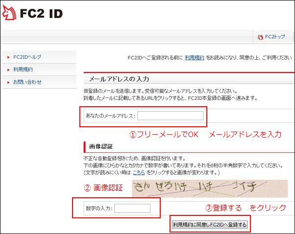 受信可能な メールアドレスと 画像認証の数字を入れます。メールアドレスは、ログインの時に 必要になるので 忘れないようにメモしておいてください。『利用規約に同意しFC2IDへ登録するを クリックします。
