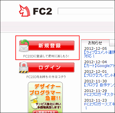 FC2のトップページ http://fc2.com/ で 新規登録をします。最初に で Fc2 の ID を 取得します。新規登録をクリックします。