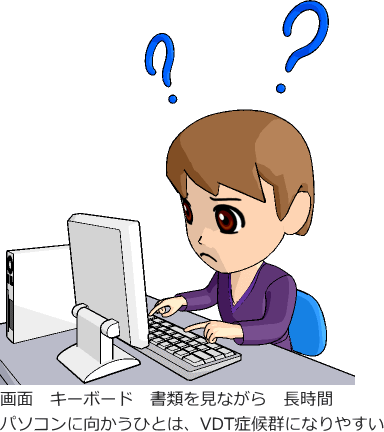 VDT症候群は、VDTとは、Visual Display Terminal(コンピュータの表示機器)の略で「目が乾いた感じがする」「光がまぶしい」と感じる 「目の疲れ・痛み」のほか キーボードを長時間 たたき続けたり 同じ姿勢で筋肉が疲労して起こる 「首、肩のこり・痛み」このように 首や肩のコリを放置していると しだいに腕も痛み出します。「腕・手首・指の疲れ」「腕がだるい・手がしびれる・指がしびれる」など すべて VDT症候群の症状です。「腱鞘炎(けんしょうえん)」も 頚肩腕(けいけんわん)症候群」もVDT症候群の症状なのです。