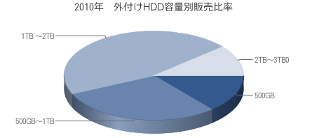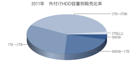 録画用HDDを用意し USB接続で 録画するのが 一般的な用途になっているようで 大容量外付けHDDの売り上げが伸びています。自分の場合、パソコンの バックアップ用に 必要なだけなので・・1TBも あれば十分なのですが、最近は、パソコンも大容量になっているので、1TB以上のHDDを 準備しておきましょう。2010年から 2011年にかけて 2TB以上 が売れている理由は、1TBと2TBの 価格差が 縮まったことですね。